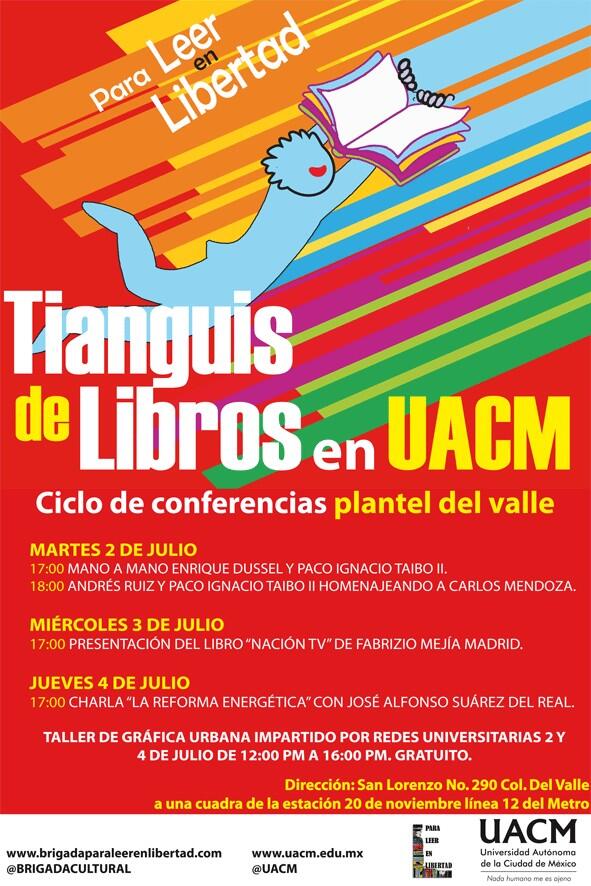 El martes 2 de julio habrá un mano a mano entre Enrique Dussel y Paco Ignacio Taibo II, así como un homenaje a Carlos Mendoza, a las 17 horas. El miércoles 3 de julio se hará la presentación del libro Nación tv de Fabrizio Mejía, a las 17 horas. El jueves 4 de julio se dictará la conferencia La reforma energética, con José Alonso Suárez del Real, a las 17 horas. La cita es en el Plantel Del Valle, en San Lorenzo 290, colonia Del Valle.
